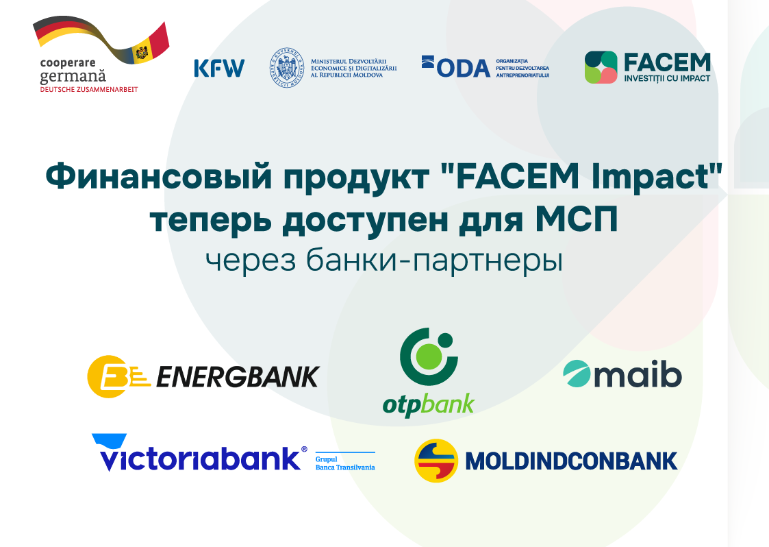 Финансовый продукт «FACEM Impact» был разработан в рамках проекта «Фонд развития МСП в Молдове» при экспертной поддержке Франкфуртской школы финансов в Германии в рамках контракта на техническую помощь (на сумму 0,7 млн евро), подписанного в декабре 2024 года, финансируемого в рамках проекта.